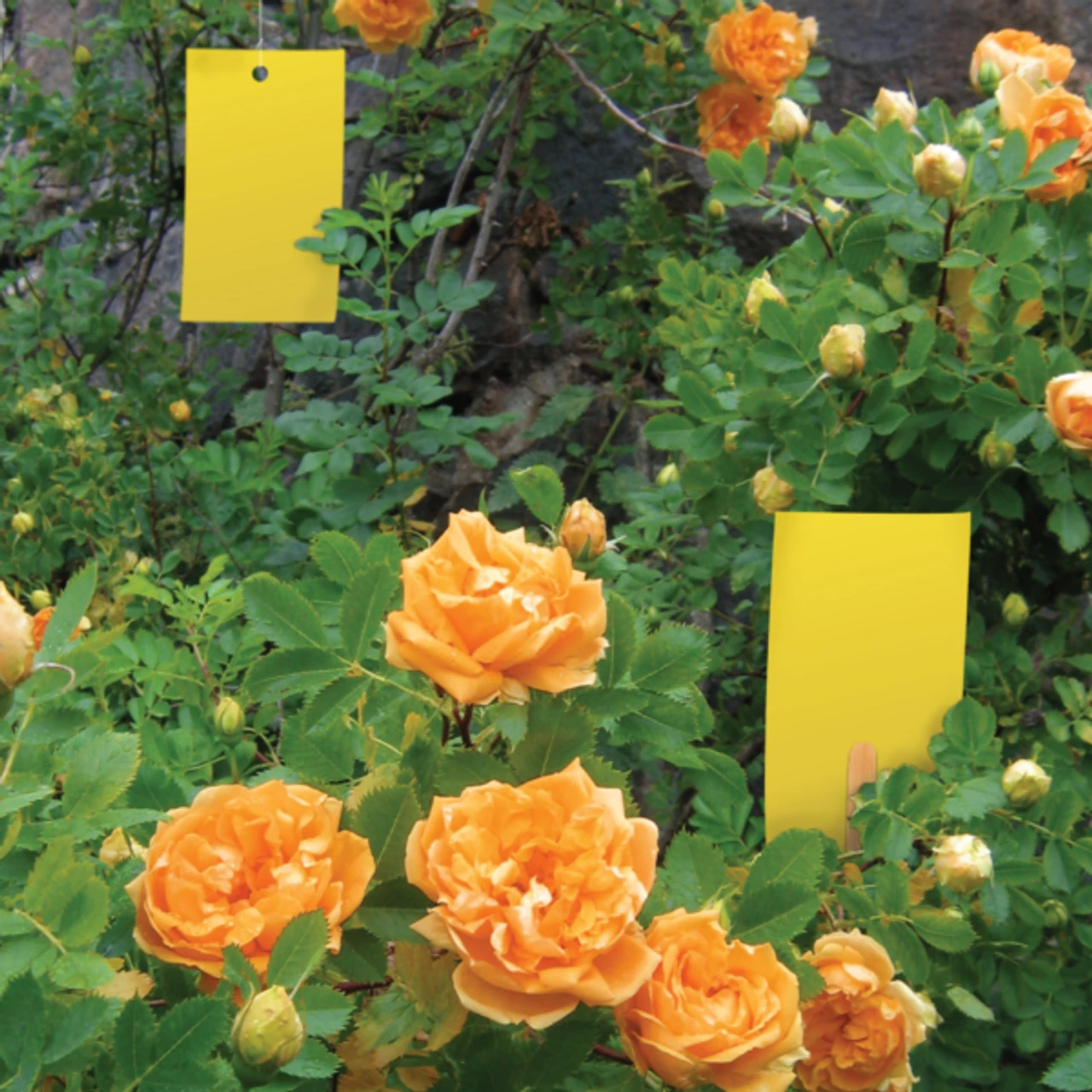 Tiny bugs such as fungus gnats and aphids damage plants by feeding on their sap or leaves. These bugs are attracted to the yellow sticky trap, which imitates a healthy plant leaf, where they land and then are captured and killed in the sticky glue.