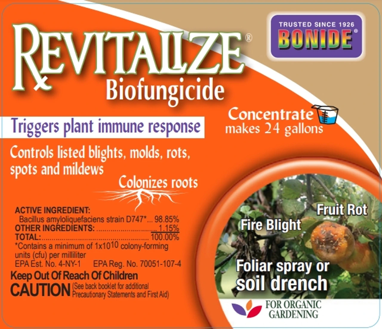 A high potency biofungicide/bactericide that controls blight, molds, rots, spots and mildews on vegetables, fruits, nuts, ornamentals, lawns, houseplants and tropical plants. It also colonizes plant root hairs, preventing the establishment of disease-causing fungi and bacteria. This organic gardening product may be used right up to the day of harvest.