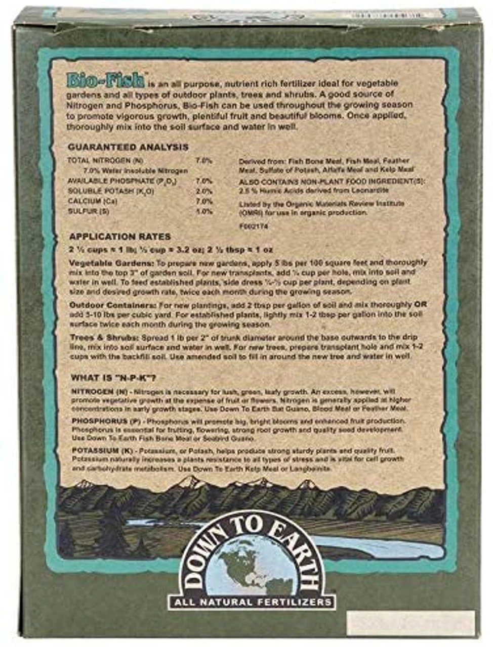 - Down to Earth Bio Fish is a five pound box of all natural fertilizer with 7-7-2 formula and is listed by the Organic Materials Review Institute (OMRI) for use in organic production