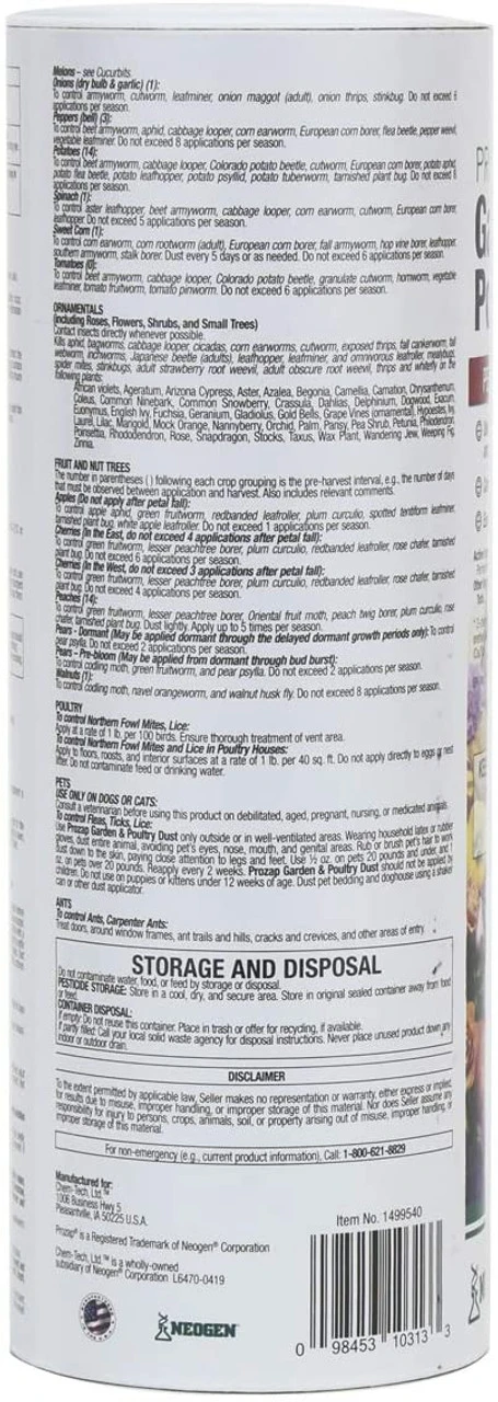 Prozap Garden & Poultry Dust is ready-to-use dust containing .25% permethrin. Garden & Poultry Dust controls aphids, bag worms, Japanese beetles, stinkbugs, Colorado potato beetle and most vegetable crop insects.